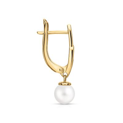 Серьги с 6 бриллиантами природными, 0.01 карат, огранка круг 17 граней, цвет 2, чистота 2, тип огранки А; 2 жемчугами пресноводными культ.белыми; Желтое золото 585 пробы.