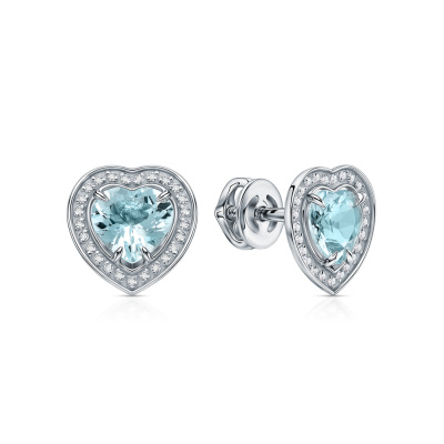 Серьги с 50 бриллиантами природными, 0.09 карат, огранка круг 17 граней, цвет 2, чистота 2, тип огранки А; 2 аквамаринами природными, 1.3 карат; Белое золото 585 пробы.