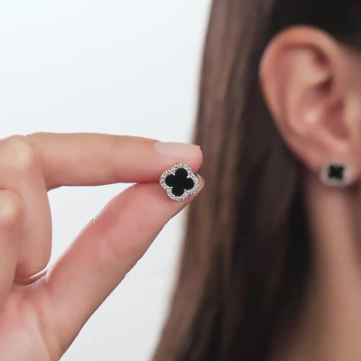 Серьги с 48 бриллиантами природными, 0.16 карат, огранка круг 17 граней, цвет 2, чистота 2, тип огранки А; 2 агатами черными природными, 1.89 карат; Розовое золото 585 пробы.