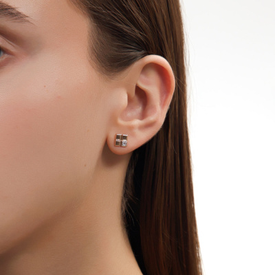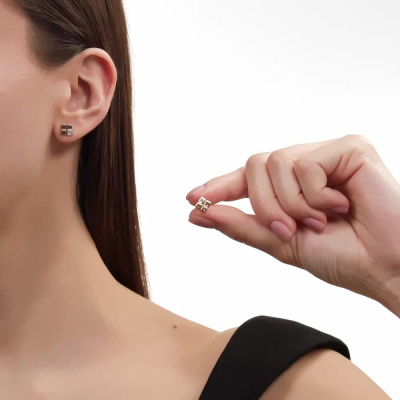 Серьги с 2 бриллиантами природными, 0.09 карат, огранка принцесса 65 граней, цвет 3, чистота 6; Розовое золото 585 пробы.