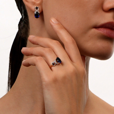Серьги с 16 бриллиантами природными, 0.06 карат, огранка круг 17 граней, цвет 2, чистота 2, тип огранки А; 2 сапфирами синтетическими, 4.28 карат; 2 сапфирами синтетическими, 0.16 карат; Розовое золото 585 пробы.