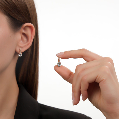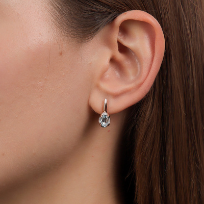 Серьги с 8 бриллиантами природными, 0.03 карат, огранка круг 17 граней, цвет 2, чистота 2, тип огранки А; 16 бриллиантами природными, 0.02 карат, огранка круг 17 граней, цвет 2, чистота 2, тип огранки А; 2 топазами скай природными, 1.77 карат; Розовое золото 585 пробы.