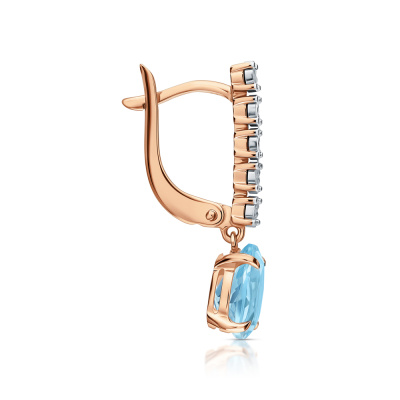 Серьги с 10 бриллиантами природными, 0.04 карат, огранка круг 17 граней, цвет 2, чистота 2, тип огранки А; 2 топазами скай природными, 2.67 карат; Розовое и белое золото 585 пробы.