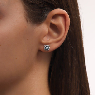 Серьги с 8 бриллиантами природными, 0.03 карат, огранка круг 17 граней, цвет 2, чистота 2, тип огранки А; 32 бриллиантами природными, 0.09 карат, огранка круг 17 граней, цвет 2, чистота 2, тип огранки А; 2 топазами свисс природными, 1.14 карат; Белое золото 585 пробы.