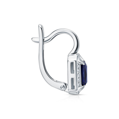 Серьги с 32 бриллиантами природными, 0.12 карат, огранка круг 17 граней, цвет 2, чистота 2, тип огранки А; 2 сапфирами синтетическими, 1.28 карат; Белое золото 585 пробы.
