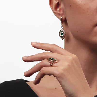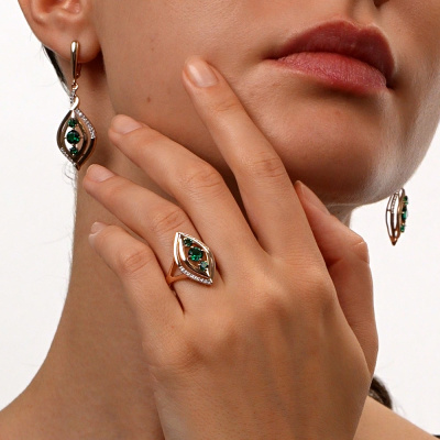 Серьги с 38 бриллиантами природными, 0.18 карат, огранка круг 17 граней, цвет 2, чистота 2; 2 гидротермальными изумрудами, 0.93 карат; 4 гидротермальными изумрудами, 0.37 карат; Розовое золото 585 пробы.