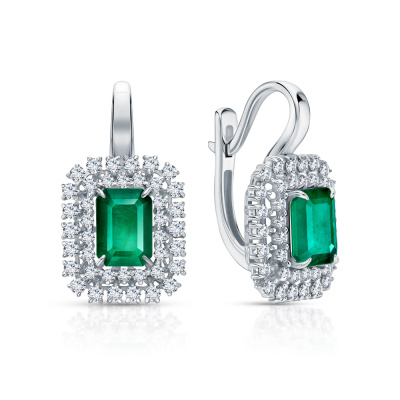 Серьги с 44 бриллиантами природными, 0.48 карат, огранка круг 57 граней, цвет 3, чистота 6, тип огранки А; 36 бриллиантами природными, 0.27 карат, огранка круг 57 граней, цвет 3, чистота 6, тип огранки А; 2 изумрудами природными, 2.04 карат, цвет 4, чистота 3, тип огранки Б; Белое золото 585 пробы.