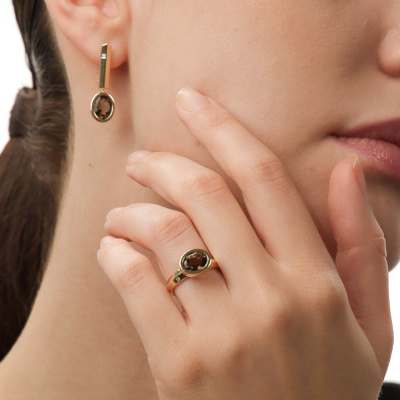 Серьги с 2 бриллиантами природными, 0.01 карат, огранка круг 57 граней, цвет 3, чистота 6, тип огранки А; 2 кварцами дымчатыми природными, 3.45 карат; Желтое золото 585 пробы.