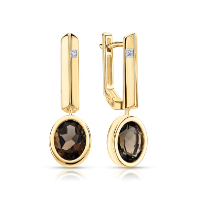 Серьги с 2 бриллиантами природными, 0.01 карат, огранка круг 57 граней, цвет 3, чистота 6, тип огранки А; 2 кварцами дымчатыми природными, 3.25 карат; Желтое золото 585 пробы.