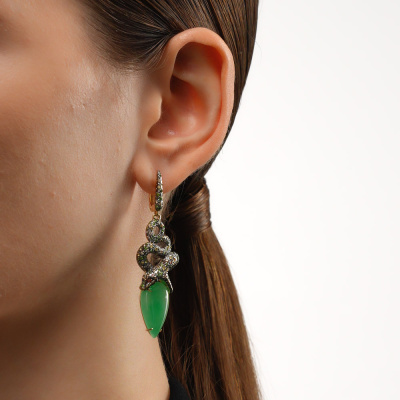 Серьги с 2 жадеитами зелеными, 20.5 карат, тип огранки А; 2 бриллиантами коричневыми природными, 0.04 карат, огранка круг 57 граней, цвет 7, чистота 5, тип огранки А; 33 сапфирами желтыми природными, 0.38 карат, тип огранки А; 47 бриллиантами коричневыми природными, 0.39 карат, огранка круг 57 граней, цвет 7, чистота 6, тип огранки А; 50 бриллиантами зелеными природными облагороженными, 0.38 карат, огранка круг 57 граней, цвет 5, чистота 5, тип огранки А; 33 сапфирами желтыми природными, 0.22 карат, тип огранки А; 68 бриллиантами зелеными природными облагороженными, 0.38 карат, огранка круг 57 граней, цвет 5, чистота 5, тип огранки А; 65 бриллиантами коричневыми природными, 0.32 карат, огранка круг 57 граней, цвет 7, чистота 5, тип огранки А; Желтое золото 585 пробы.