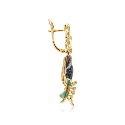 Серьги с 20 бриллиантами природными, 0.09 карат, огранка круг 57 граней, цвет 3, чистота 6, тип огранки А; 6 сапфирами желтыми природными, 0.29 карат, тип огранки А; 6 сапфирами желтыми природными, 0.21 карат, тип огранки А; 26 сапфирами желтыми природными, 0.3 карат, тип огранки А; 98 бриллиантами черными природными облагороженными, 0.77 карат, огранка круг 57 граней, цвет 7, чистота 6, тип огранки А; 56 бриллиантами черными природными облагороженными, 0.36 карат, огранка круг 57 граней, цвет 7, чистота 6, тип огранки А; 34 сапфирами оранжевыми природными, 0.19 карат, тип огранки А; эмаль витражная; Желтое золото 585 пробы.