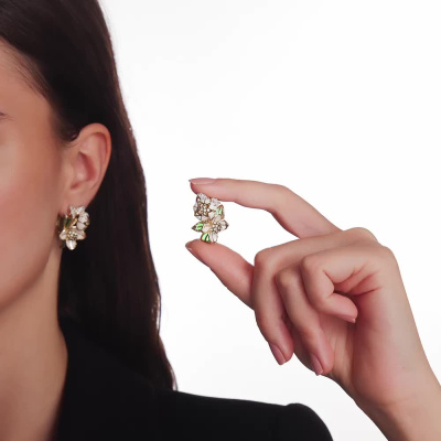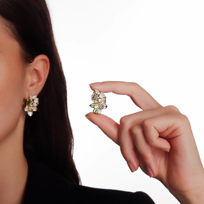 Серьги с 44 бриллиантами природными, 0.2 карат, огранка круг 57 граней, цвет 3, чистота 6, тип огранки А; 40 сапфирами желтыми природными, 0.49 карат, тип огранки А; 54 бриллиантами зелеными природными облагороженными, 0.31 карат, огранка круг 57 граней, цвет 5, чистота 5, тип огранки А; эмаль белая; эмаль зеленая; Желтое золото 585 пробы.