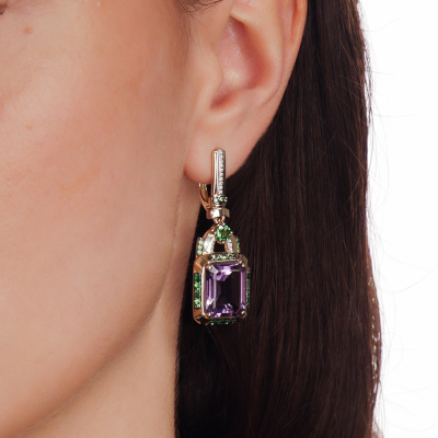 Серьги с 32 бриллиантами природными, 0.15 карат, огранка круг 57 граней, цвет 3, чистота 5, тип огранки А; 2 аметистами природными, 10.88 карат, тип огранки А; 2 гранатами зелеными природными, 0.52 карат, тип огранки А; 28 гранатами зелеными природными, 0.72 карат, тип огранки А; 6 гранатами зелеными природными, 0.05 карат, тип огранки А; 12 гранатами зелеными природными, 0.06 карат, тип огранки А; Желтое золото 585 пробы.