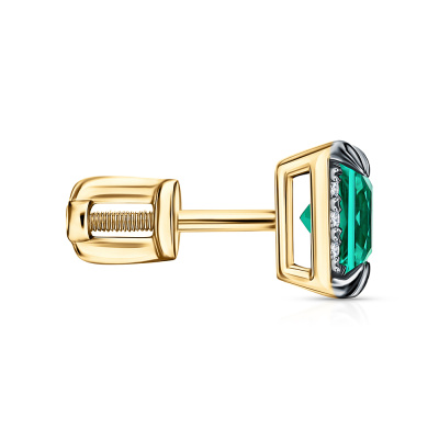 Серьги с 2 изумрудами выращенными Колумбия, 1.09 карат; 24 бриллиантами выращенными, 0.14 карат, огранка круг 57 граней, цвет 3, чистота 5, тип огранки А; Желтое золото 585 пробы.