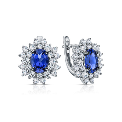 Серьги с 2 сапфирами выращенными, 3.06 карат; 12 бриллиантами выращенными, 0.65 карат, огранка круг 57 граней, цвет 3, чистота 5, тип огранки А; 24 бриллиантами выращенными, 0.8 карат, огранка круг 57 граней, цвет 3, чистота 5, тип огранки А; 12 бриллиантами выращенными, 0.32 карат, огранка круг 57 граней, цвет 3, чистота 5, тип огранки А; Белое золото 585 пробы.