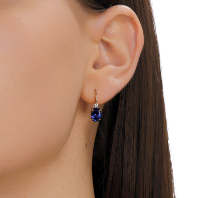 Серьги с 2 сапфирами выращенными, 3.06 карат; 2 бриллиантами выращенными, 0.06 карат, огранка круг 57 граней, цвет 3, чистота 5, тип огранки А; Розовое золото 585 пробы.