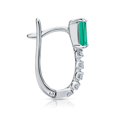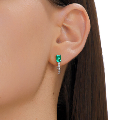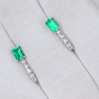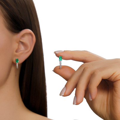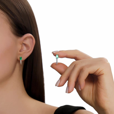 Серьги с 2 изумрудами выращенными Колумбия, 0.9 карат; 10 бриллиантами выращенными, 0.13 карат, огранка круг 57 граней, цвет 3, чистота 5, тип огранки А; Белое золото 585 пробы.