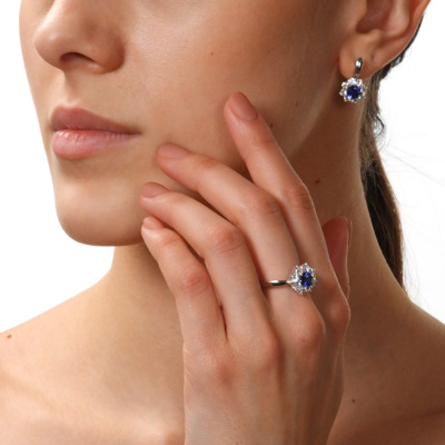 Серьги с 2 сапфирами выращенными, 1.63 карат; 16 бриллиантами выращенными, 1.25 карат, огранка круг 57 граней, цвет 3, чистота 5, тип огранки А; Белое золото 585 пробы.