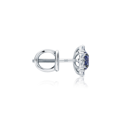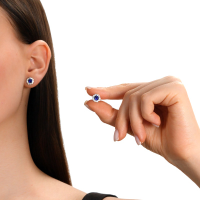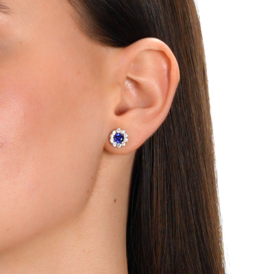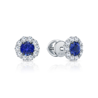 Серьги с 2 сапфирами выращенными, 1.23 карат; 20 бриллиантами выращенными, 0.63 карат, огранка круг 57 граней, цвет 3, чистота 5, тип огранки А; Белое золото 585 пробы.
