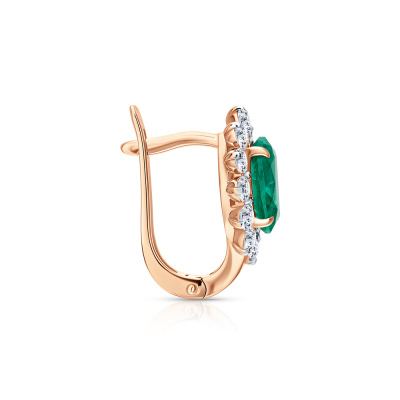 Серьги с 2 изумрудами выращенными Колумбия, 2.05 карат; 24 бриллиантами выращенными, 0.98 карат, огранка круг 57 граней, цвет 3, чистота 5, тип огранки А; Розовое золото 585 пробы.
