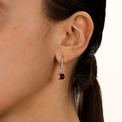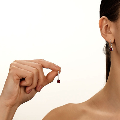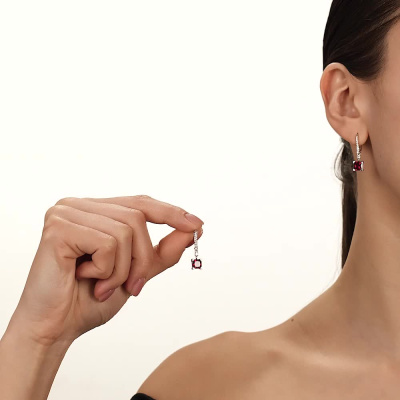 Серьги с 2 рубинами выращенными, 2.63 карат; 2 бриллиантами выращенными, 0.06 карат, огранка круг 57 граней, цвет 3, чистота 5, тип огранки А; 4 бриллиантами выращенными, 0.04 карат, огранка круг 57 граней, цвет 3, чистота 5, тип огранки А; 6 бриллиантами выращенными, 0.04 карат, огранка круг 57 граней, цвет 3, чистота 5, тип огранки А; 6 бриллиантами выращенными, 0.02 карат, огранка круг 57 граней, цвет 3, чистота 5, тип огранки А; Белое золото 585 пробы.