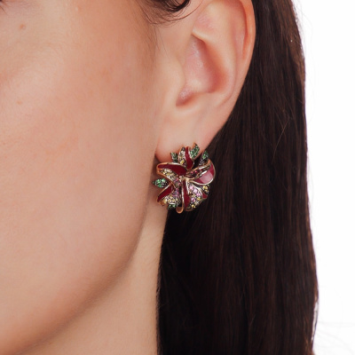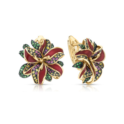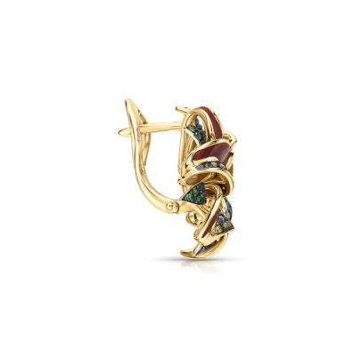 Золотые серьги с бриллиантами природными, эмалью, гранатами природными и сапфирами природными