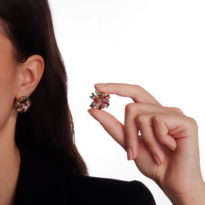 Серьги с 28 сапфирами розовыми природными, 0.31 карат, тип огранки А; 30 бриллиантами желтыми природными облагороженными, 0.29 карат, огранка круг 57 граней, цвет 5, чистота 5, тип огранки А; 86 гранатами зелеными природными, 0.56 карат, тип огранки А; 14 сапфирами розовыми природными, 0.08 карат, тип огранки А; 26 бриллиантами желтыми природными облагороженными, 0.13 карат, огранка круг 57 граней, цвет 5, чистота 5, тип огранки А; эмаль витражная; Желтое золото 585 пробы.