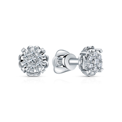 Серьги с 2 бриллиантами природными, 0.03 карат, огранка круг 57 граней, цвет 3, чистота 6, тип огранки А; 12 бриллиантами природными, 0.1 карат, огранка круг 57 граней, цвет 3, чистота 6, тип огранки А; Белое золото 585 пробы.