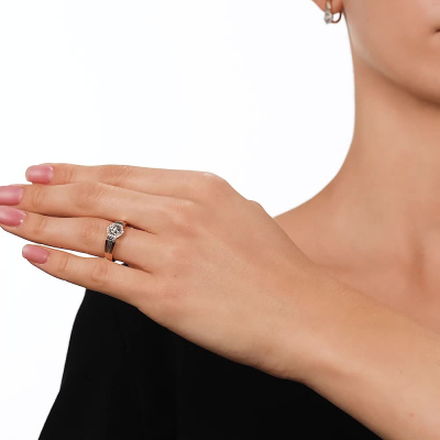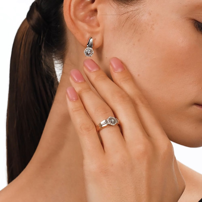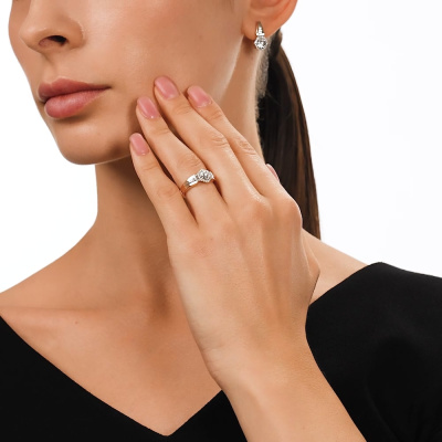 Серьги с 2 бриллиантами природными, 0.03 карат, огранка круг 57 граней, цвет 3, чистота 6, тип огранки А; 36 бриллиантами природными, 0.11 карат, огранка круг 17 граней, цвет 2, чистота 3, тип огранки А; Розовое и белое золото 585 пробы.