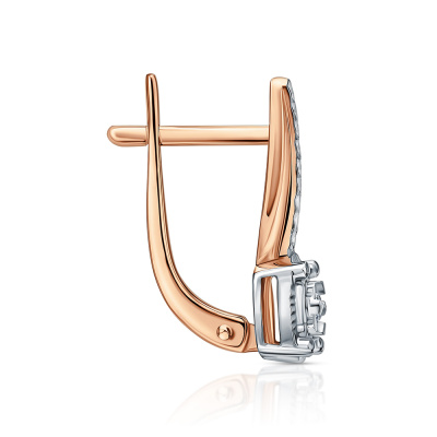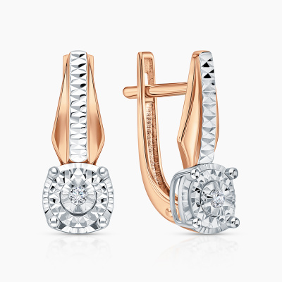Серьги с 2 бриллиантами природными, 0.03 карат, огранка круг 57 граней, цвет 3, чистота 6, тип огранки А; Розовое и белое золото 585 пробы.