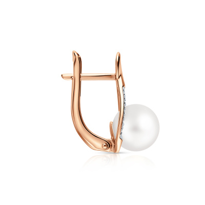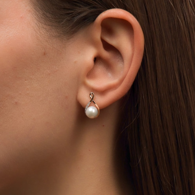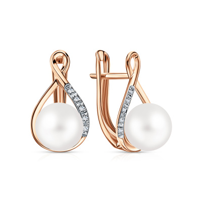 Серьги с 10 бриллиантами природными, 0.04 карат, огранка круг 17 граней, цвет 2, чистота 2, тип огранки А; 2 жемчугами пресноводными культ.белыми; Розовое золото 585 пробы.