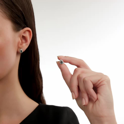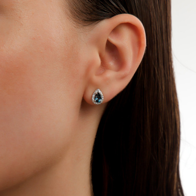 Серьги с 30 бриллиантами природными, 0.12 карат, огранка круг 17 граней, цвет 2, чистота 2, тип огранки А; 2 топазами лондон природными, 0.82 карат; Белое золото 585 пробы.