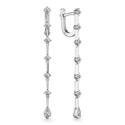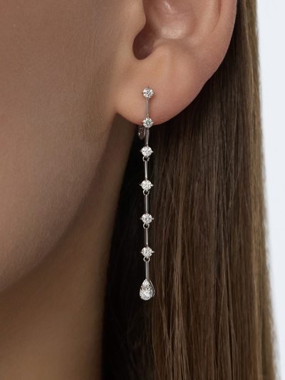 Серьги с 2 бриллиантами природными, 0.14 карат, огранка круг 57 граней, цвет 4, чистота 6, тип огранки А; 12 бриллиантами природными, 0.62 карат, огранка круг 57 граней, цвет 4, чистота 6, тип огранки А; 2 бриллиантами природными, 0.02 карат, огранка круг 57 граней, цвет 4, чистота 6, тип огранки А; Белое золото 585 пробы.