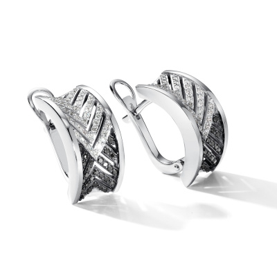 Серьги с 82 бриллиантами природными, 0.39 карат, огранка круг 57 граней, цвет 4, чистота 5, тип огранки А; 52 бриллиантами черными природными облагороженными, 0.3 карат, огранка круг 57 граней, цвет 7, чистота 6, тип огранки А; Белое золото 585 пробы.