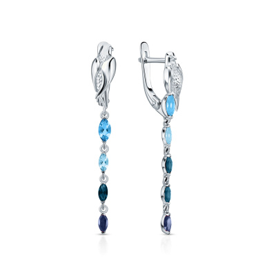 Серьги с 2 топазами свисс природными, 0.32 карат; 2 сапфирами природными, 0.2 карат, цвет 2, чистота 2, тип огранки Б; 2 топазами свисс природными, 0.18 карат; 3 топазами лондон природными, 0.26 карат; Белое золото 585 пробы.