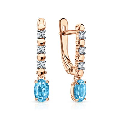 Серьги с 2 топазами свисс природными, 0.98 карат; 6 бриллиантами выращенными, 0.19 карат, огранка круг 57 граней, цвет 3, чистота 5; Розовое золото 585 пробы.