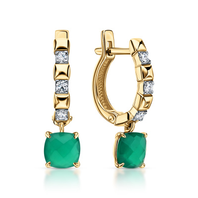Серьги с 6 бриллиантами выращенными, 0.19 карат, огранка круг 57 граней, цвет 3, чистота 5; 2 агатами зелеными природными; Желтое золото 585 пробы.