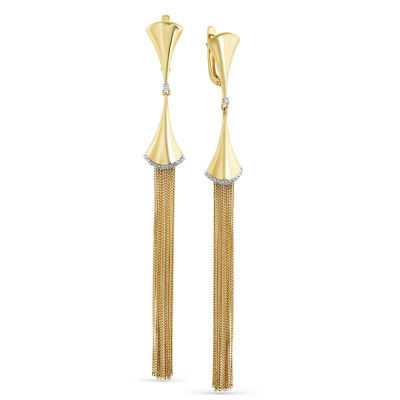 Серьги с 2 бриллиантами природными, 0.04 карат, огранка круг 57 граней, цвет 4, чистота 5, тип огранки А; 22 бриллиантами природными, 0.07 карат, огранка круг 57 граней, цвет 3, чистота 5, тип огранки А; Желтое золото 585 пробы.