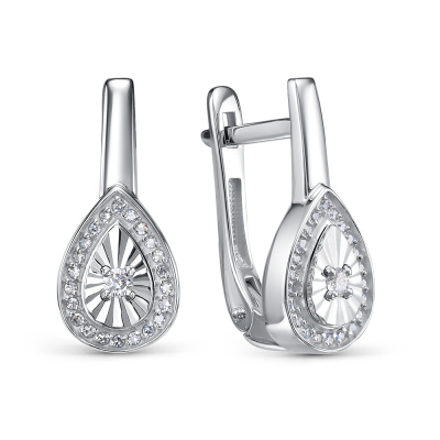 Серьги с 2 бриллиантами природными, 0.04 карат, огранка круг 57 граней, цвет 3, чистота 6, тип огранки А; 44 бриллиантами природными, 0.08 карат, огранка круг 17 граней, цвет 2, чистота 3, тип огранки А; Белое золото 585 пробы.