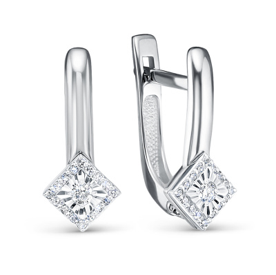 Серьги с 2 бриллиантами природными, 0.04 карат, огранка круг 57 граней, цвет 3, чистота 6, тип огранки А; 32 бриллиантами природными, 0.06 карат, огранка круг 17 граней, цвет 2, чистота 3, тип огранки А; Белое золото 585 пробы.