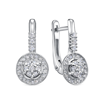 Серьги с 2 бриллиантами природными, 0.04 карат, огранка круг 57 граней, цвет 3, чистота 6, тип огранки А; 18 бриллиантами природными, 0.26 карат, огранка круг 57 граней, цвет 3, чистота 6, тип огранки А; 36 бриллиантами природными, 0.14 карат, огранка круг 17 граней, цвет 2, чистота 3, тип огранки А; Белое золото 585 пробы.