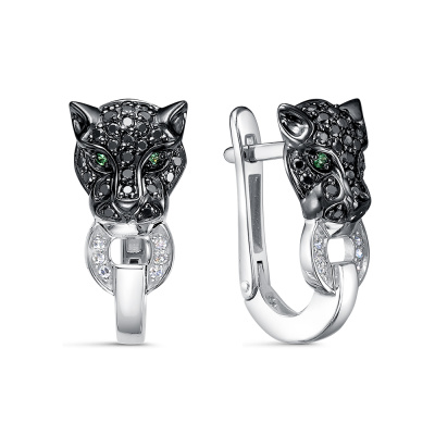 Серьги с 12 бриллиантами природными, 0.04 карат, огранка круг 17 граней, цвет 2, чистота 3, тип огранки А; 4 бриллиантами черными природными облагороженными, 0.03 карат, огранка круг 57 граней, цвет 7, чистота 6, тип огранки А; 46 бриллиантами черными природными облагороженными, 0.21 карат, огранка круг 57 граней, цвет 7, чистота 6, тип огранки А; 4 изумрудами природными, 0.01 карат, цвет 3, чистота 3, тип огранки Б; Белое золото 585 пробы.