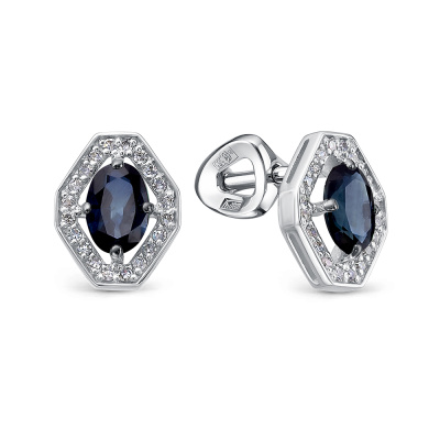 Серьги с 40 бриллиантами природными, 0.15 карат, огранка круг 17 граней, цвет 2, чистота 3, тип огранки А; 2 сапфирами природными, 1.12 карат, цвет 2, чистота 2, тип огранки Б; Белое золото 585 пробы.