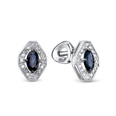 Серьги с 32 бриллиантами природными, 0.12 карат, огранка круг 17 граней, цвет 2, чистота 3, тип огранки А; 2 сапфирами природными, 0.57 карат, цвет 2, чистота 2, тип огранки Б; Белое золото 585 пробы.