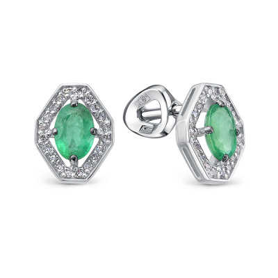 Серьги с 40 бриллиантами природными, 0.16 карат, огранка круг 17 граней, цвет 2, чистота 3, тип огранки А; 2 изумрудами природными, 0.79 карат, цвет 3, чистота 3, тип огранки Б; Белое золото 585 пробы.