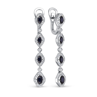 Серьги с 6 бриллиантами природными, 0.12 карат, огранка круг 57 граней, цвет 3, чистота 6, тип огранки А; 128 бриллиантами природными, 0.48 карат, огранка круг 17 граней, цвет 2, чистота 3, тип огранки А; 8 сапфирами природными, 2.28 карат, цвет 2, чистота 2, тип огранки Б; Белое золото 585 пробы.