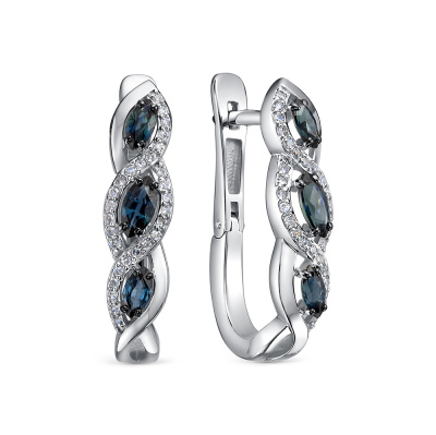 Серьги с 56 бриллиантами природными, 0.1 карат, огранка круг 17 граней, цвет 2, чистота 3, тип огранки А; 6 сапфирами природными, 0.75 карат, цвет 2, чистота 2, тип огранки Б; Белое золото 585 пробы.