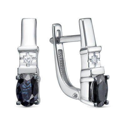 Серьги с 2 бриллиантами природными, 0.03 карат, огранка круг 57 граней, цвет 3, чистота 6, тип огранки А; 2 сапфирами природными, 1.1 карат, цвет 2, чистота 2, тип огранки Б; Белое золото 585 пробы.