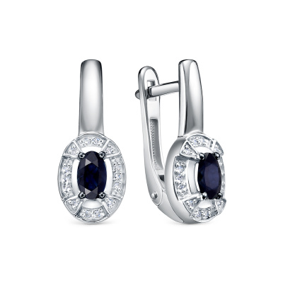 Серьги с 28 бриллиантами природными, 0.05 карат, огранка круг 17 граней, цвет 2, чистота 3, тип огранки А; 2 сапфирами природными, 0.55 карат, цвет 2, чистота 2, тип огранки Б; Белое золото 585 пробы.