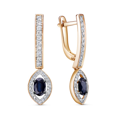 Серьги с 20 бриллиантами природными, 0.3 карат, огранка круг 57 граней, цвет 3, чистота 6, тип огранки А; 44 бриллиантами природными, 0.15 карат, огранка круг 17 граней, цвет 2, чистота 3, тип огранки А; 2 сапфирами природными, 1.09 карат, цвет 2, чистота 2, тип огранки Б; Розовое золото 585 пробы.